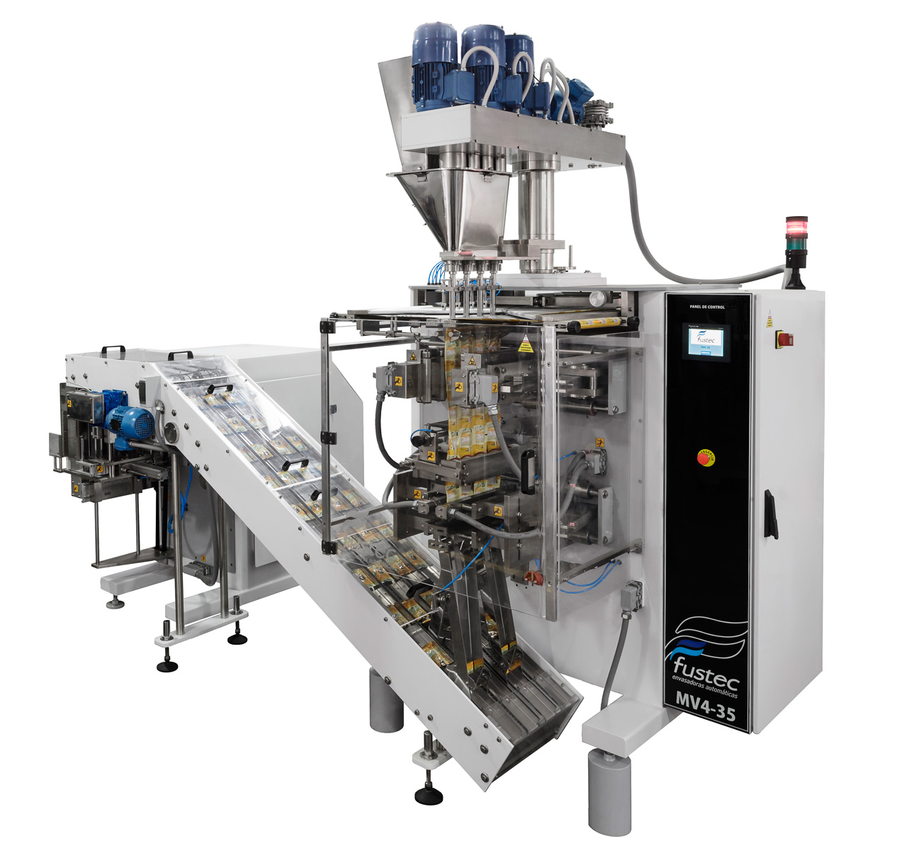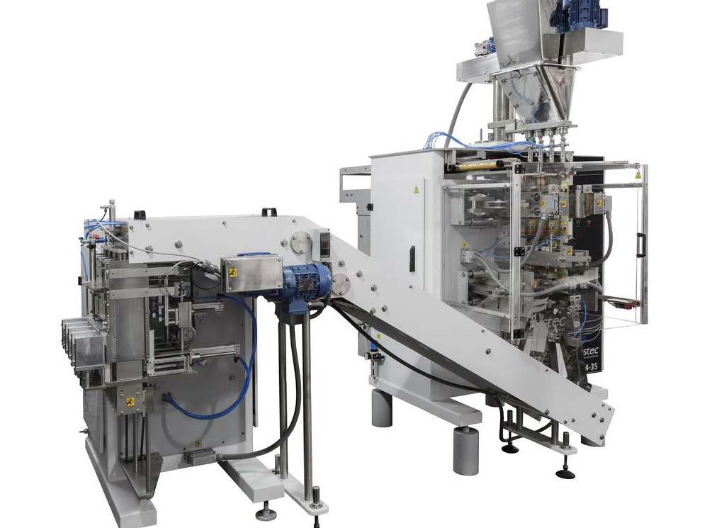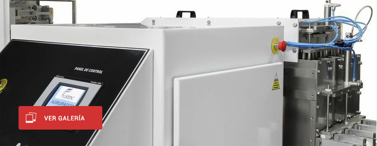 Máquina de agrupado y encajado de sobres de cuatro costuras, modelo AGR4, apto para recibir hasta cuatro (4) líneas de descarga de máquina envasadora automática, marca FUSTEC.