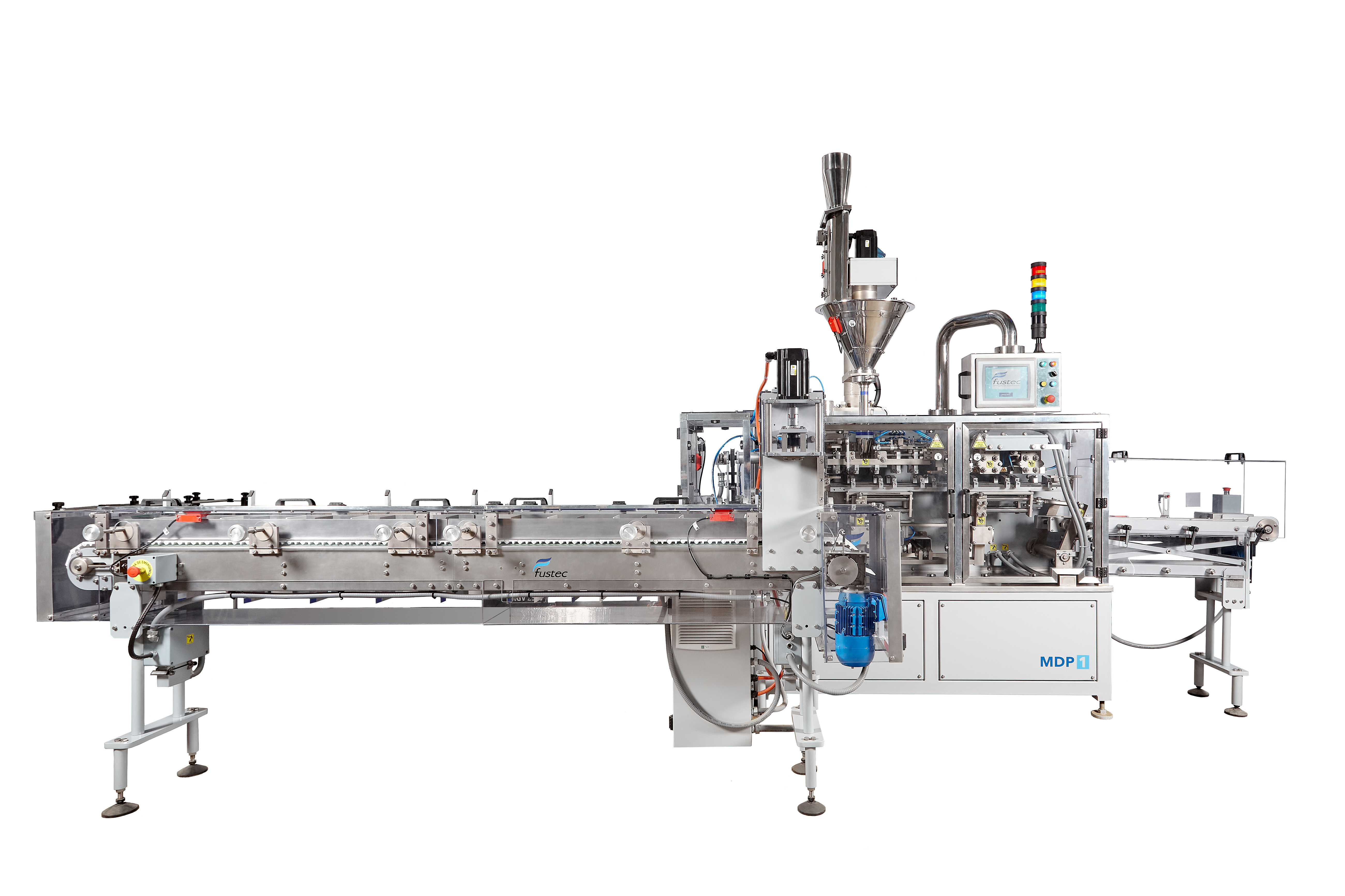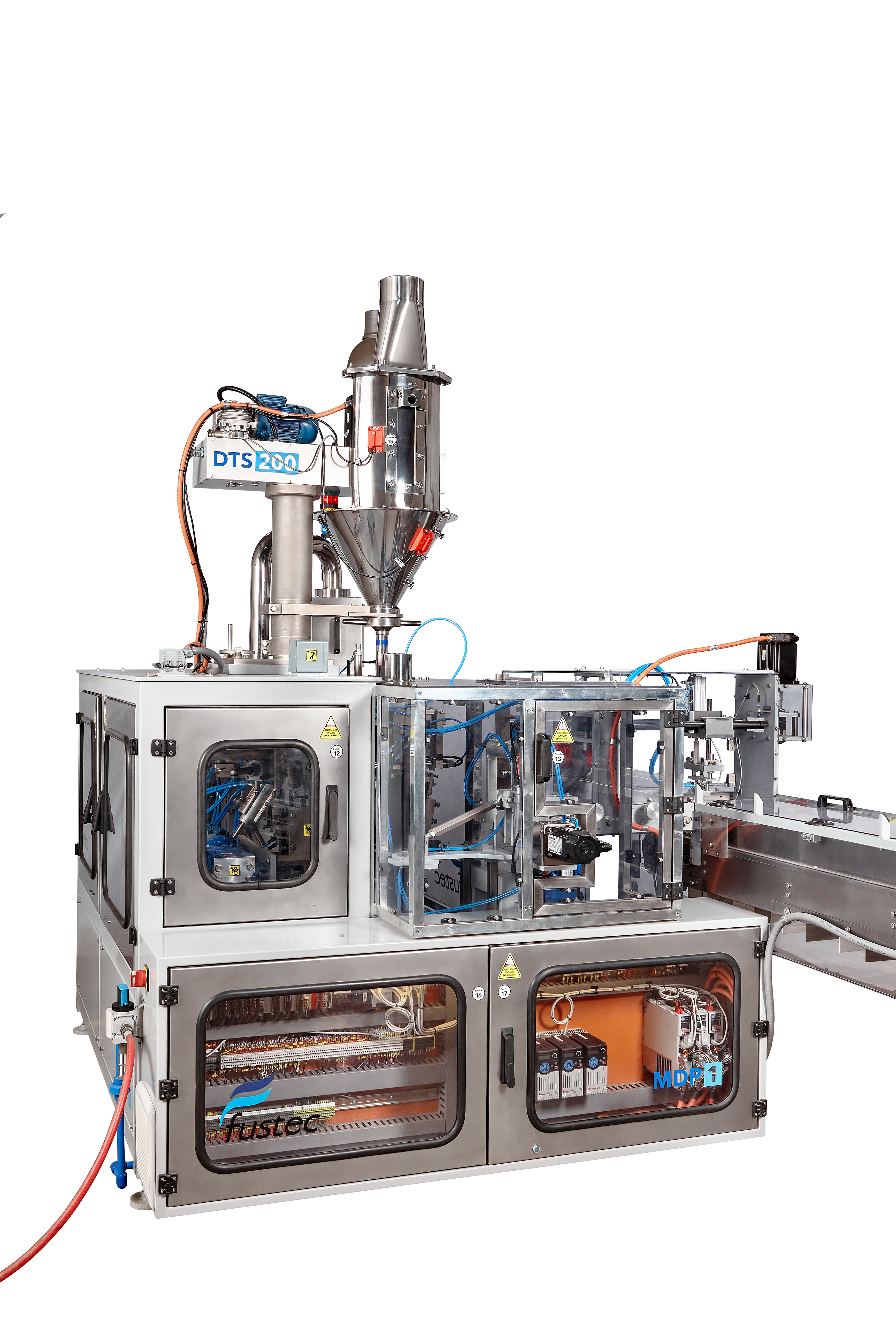 Máquina llenadora horizontal, lineal, automática, para envases pre confeccionados doypacks. Intermitente, de avance de envases en posición vertical mediante un conjunto de peines de traslado. Consta de estaciones de recepción, soplado de apertura de envases, dosificado, sellado de costura horizontal y salida de producto terminado a través de una cinta transportadora.